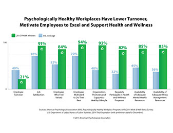 Since 1999, the American Psychological Association has recognized organizations as "psychologically healthy workplaces." These companies have greater engagement, employees are growing and developing, there is attention to work-life balance, health and safety is provided for the workforce, and there is an effort to recognize valuable contributors to the success of the company.