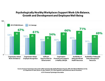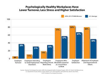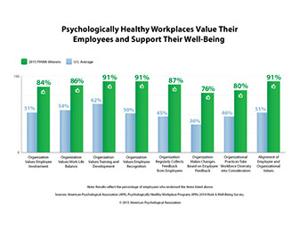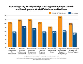 Since 1999, the American Psychological Association has recognized organizations as "psychologically healthy workplaces." These companies have greater engagement, employees are growing and developing, there is attention to work-life balance, health and safety is provided for the workforce, and there is an effort to recognize valuable contributors to the success of the company.